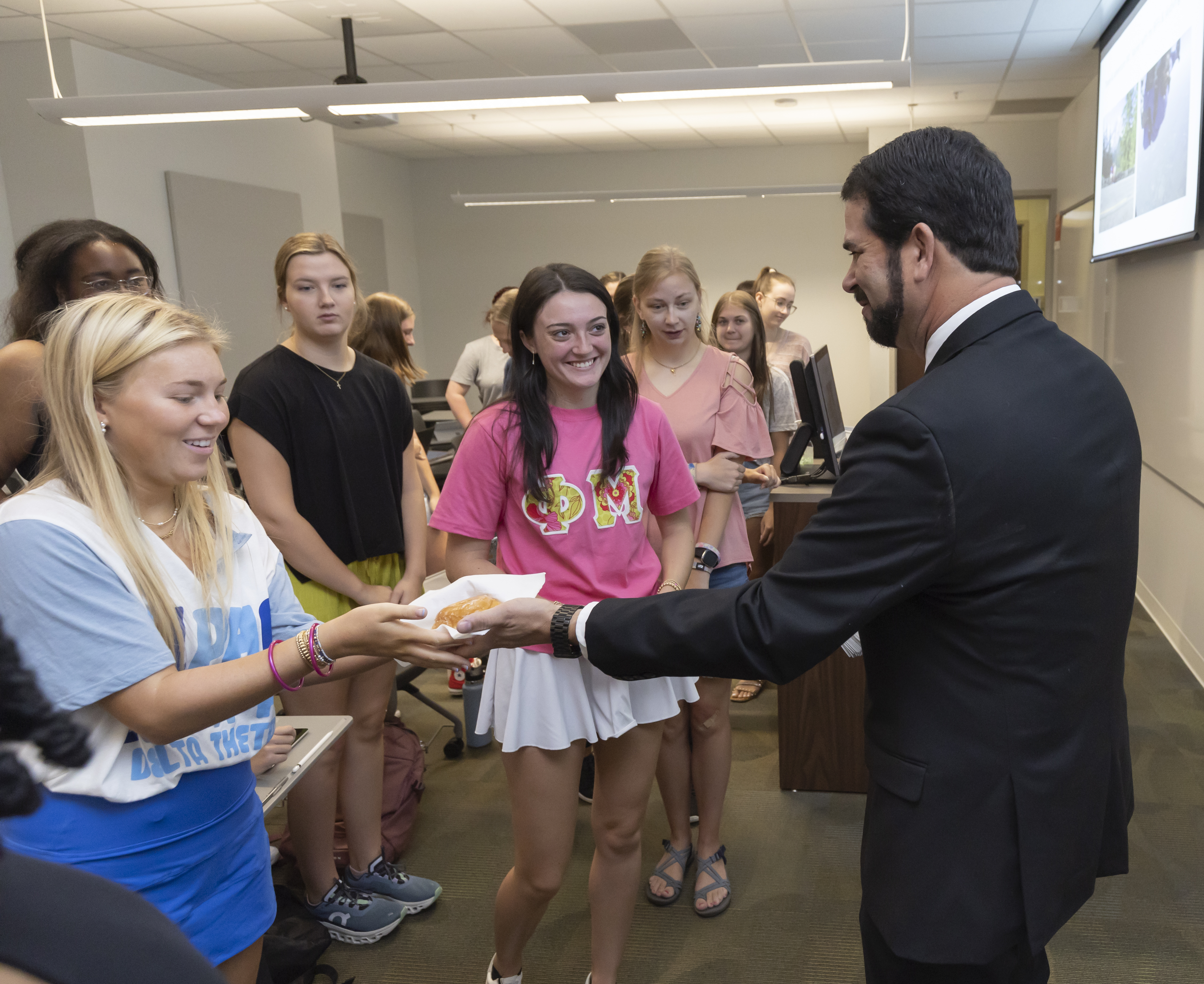 在美高梅博彩,上课的第一天总是甜甜圈日。 这是vs上校长Richard a . Carvajal博士参观教室并帮助学生和教师庆祝校园新学期开始的一个机会。
